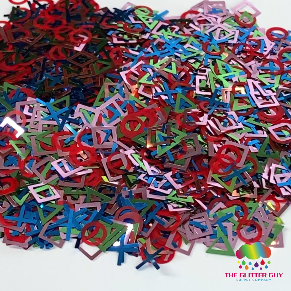 Game Over is a metallic red, blue, green and pink various shaped glitter.