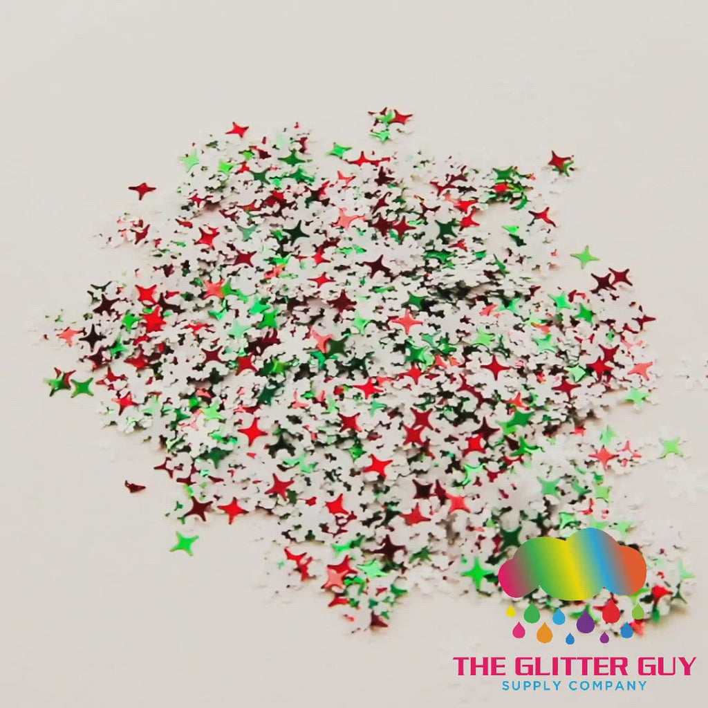 Son of a Nutcracker is a blend of metallic white snowflake shape with red and green 4-pointed star shape cut glitter.