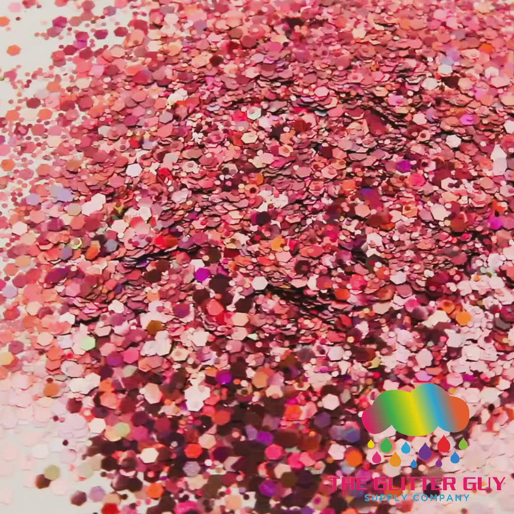 Basic is a chunky mix of various sized holographic rose gold hexagonal cut glitter.
