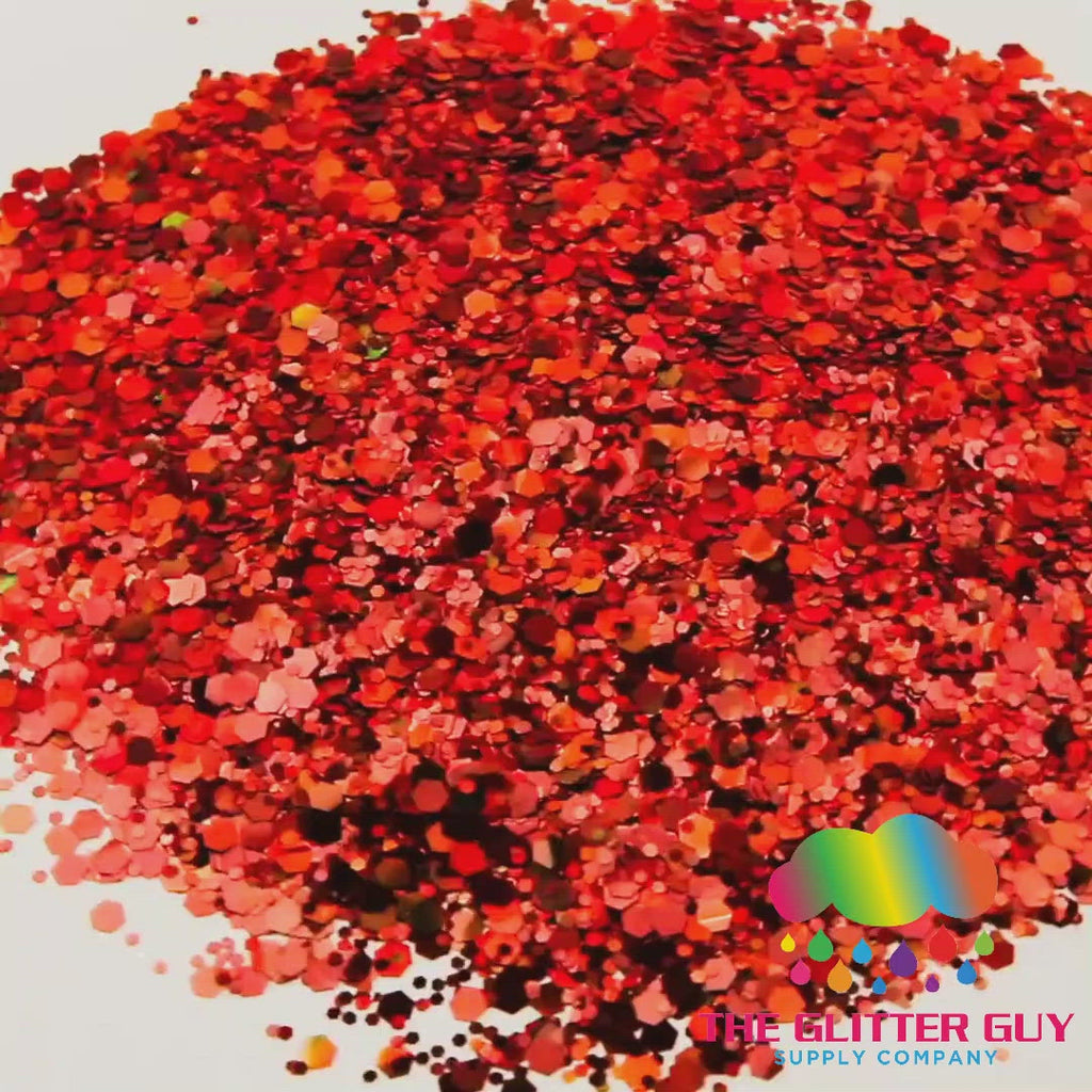 Demogorgon is a chunky mix of various sized holographic dark red/orange hexagonal cut glitter.